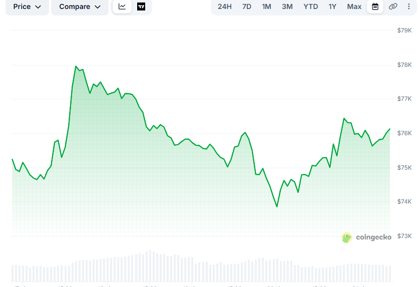 Over the past 24 hours, though, the asset started pumping again and currently trades at around $76,400 (per CoinGecko’s data). This represents a 2% daily increase and a significant 11% rise over two weeks.