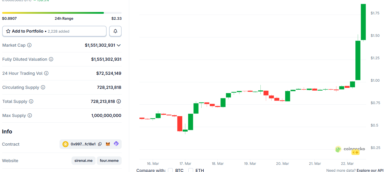 Even if you scroll to the daily performance, what a daily performance it is. SIREN has rocketed by 135% (that’s 135%, yes) in the past day. It marked a few consecutive all-time highs today, with the latest being at $2.33 hours ago (mind you, there might be another by the time you have read this article).