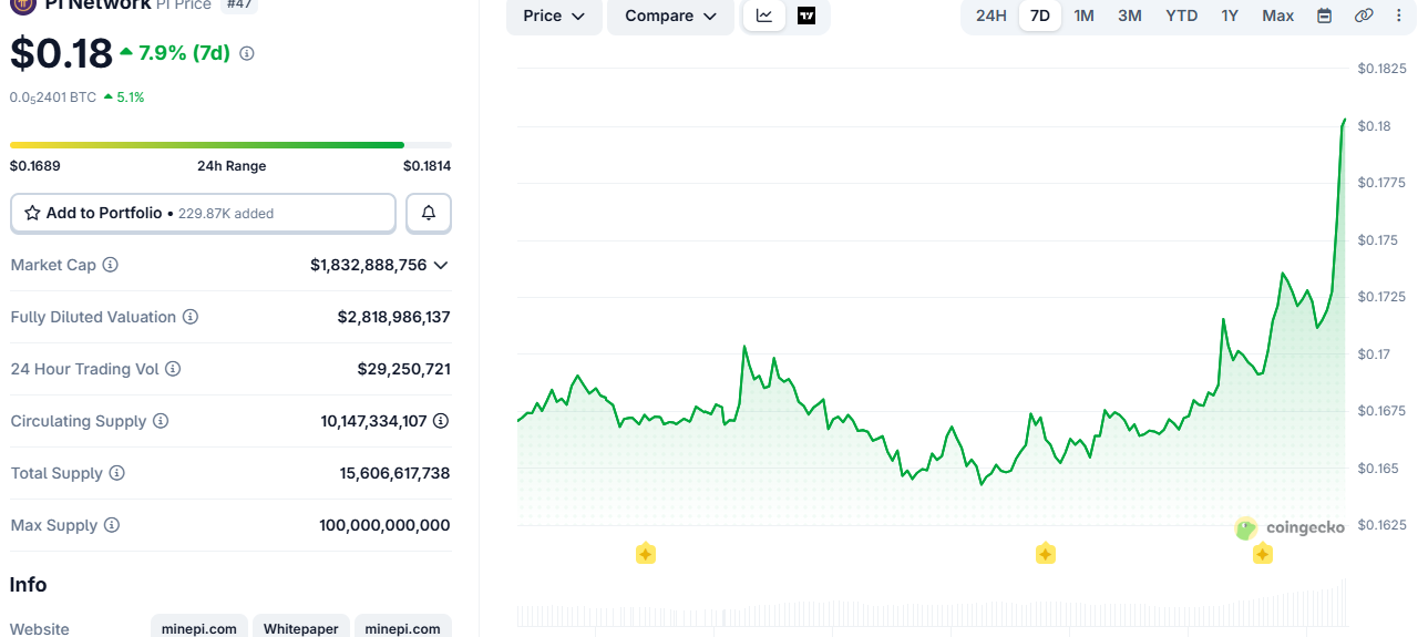 After consecutive weeks of consistently trading downward, Pi Network’s native token has finally staged a more impressive recovery over the past 24 hours or so, surging to and just over $0.18.