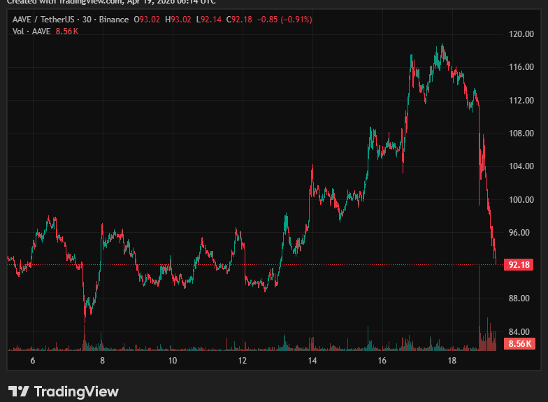 These considerable market sales only exacerbated AAVE’s price decline. The token had peaked at almost $120 yesterday, but crashed to $103 when the initial sales began. Shortly after, it plunged to $92, which represented a 22% decline from top to bottom so far.